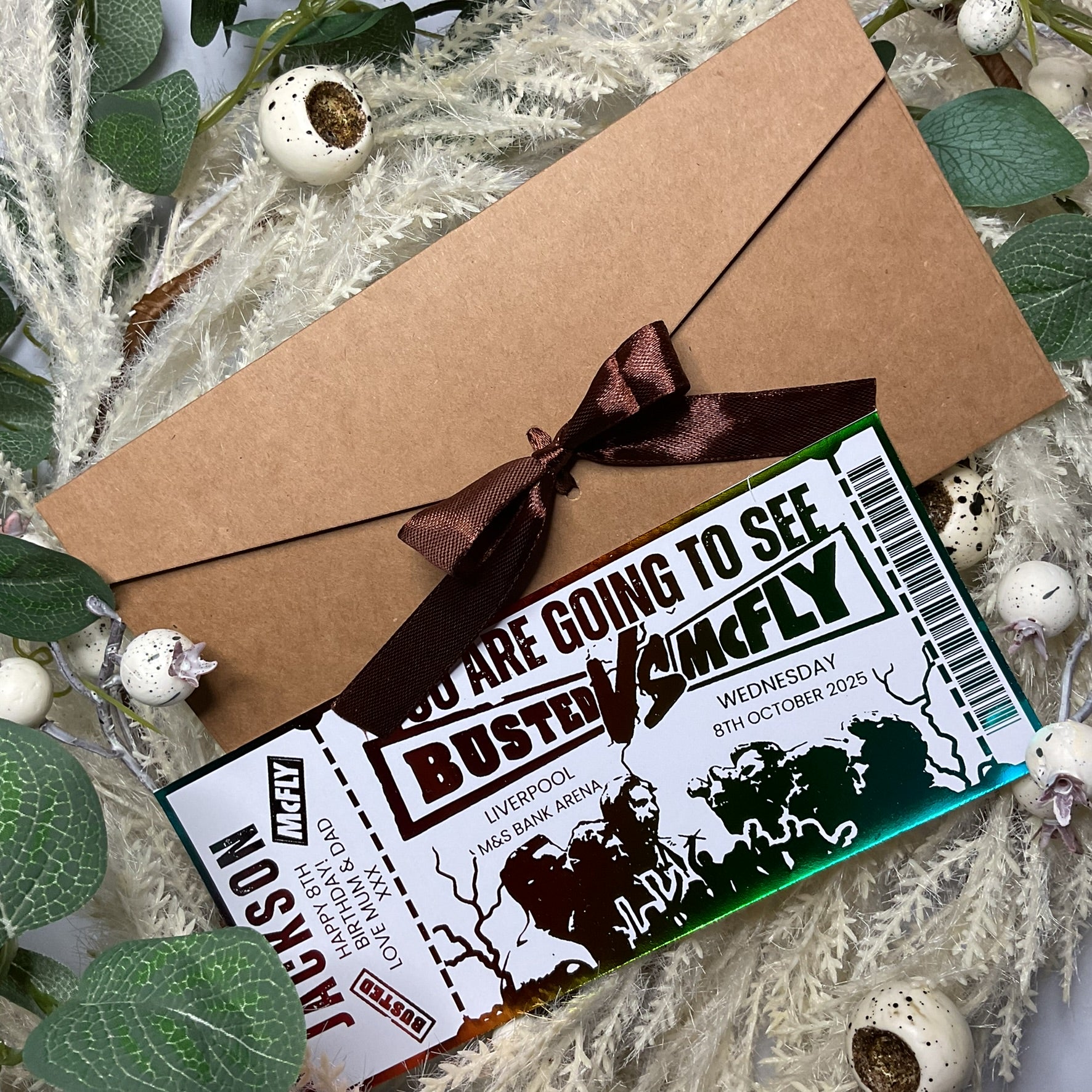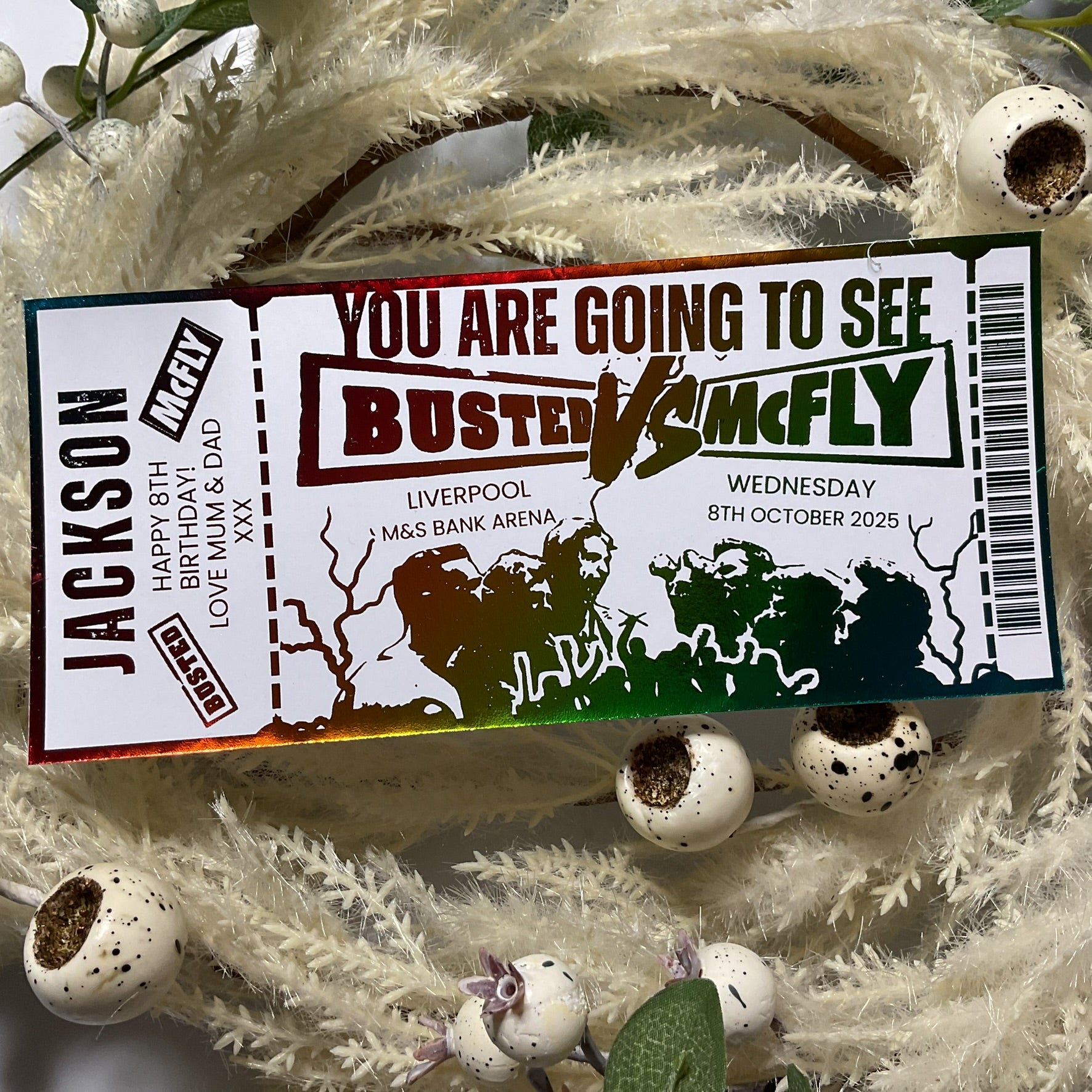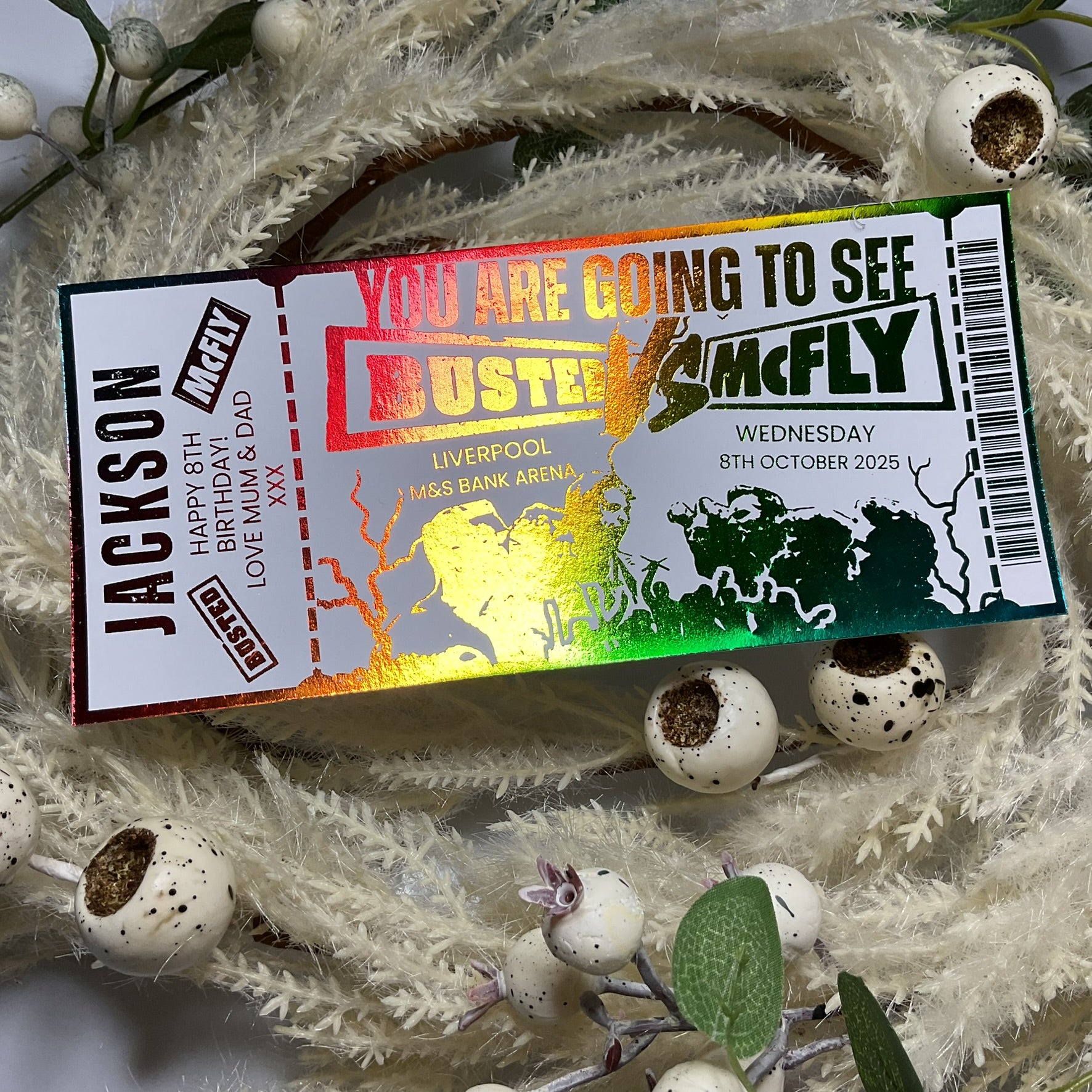 Give the ultimate nostalgic gift to a pop-punk fan with this awesome, Personalised Foiled Concert Ticket! This is the perfect item to announce tickets to a Busted vs. McFly show or to serve as a high-quality, commemorative prop for a memorable gig.