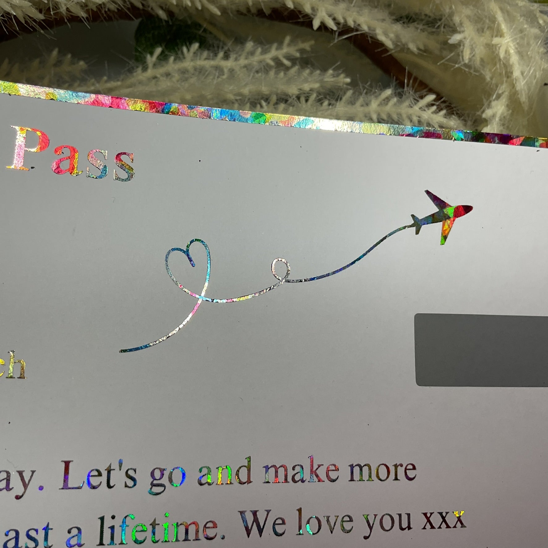 Designed to look like an authentic plane ticket, this voucher features a charming plane path graphic and a unique holographic rainbow foil that shimmers beautifully. The scratch reveal panel hides the destination, making the surprise last until the very end.