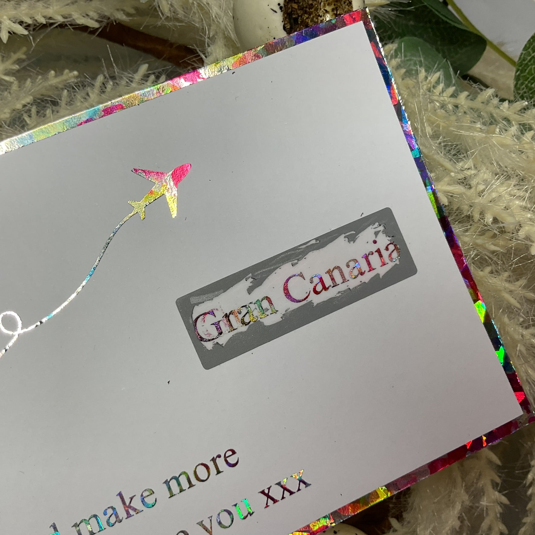 Scratch Reveal Surprise – The Destination is hidden under the scratch-off panel (e.g., 'Gran Canaria'), creating an interactive and memorable reveal.
