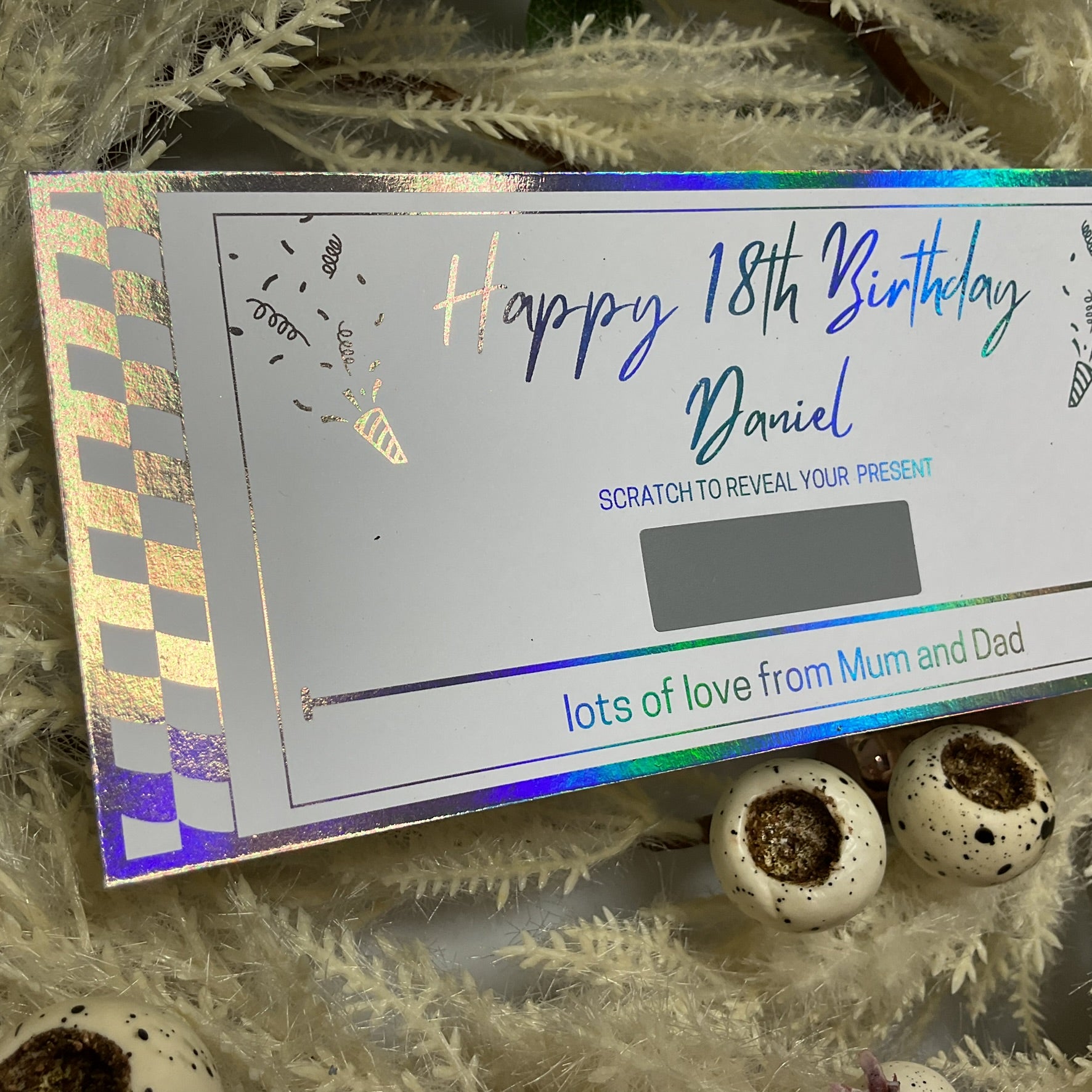 Personalised Message – Includes one line of personalised message, for example, "lots of love from Mum and Dad", below the scratch panel.