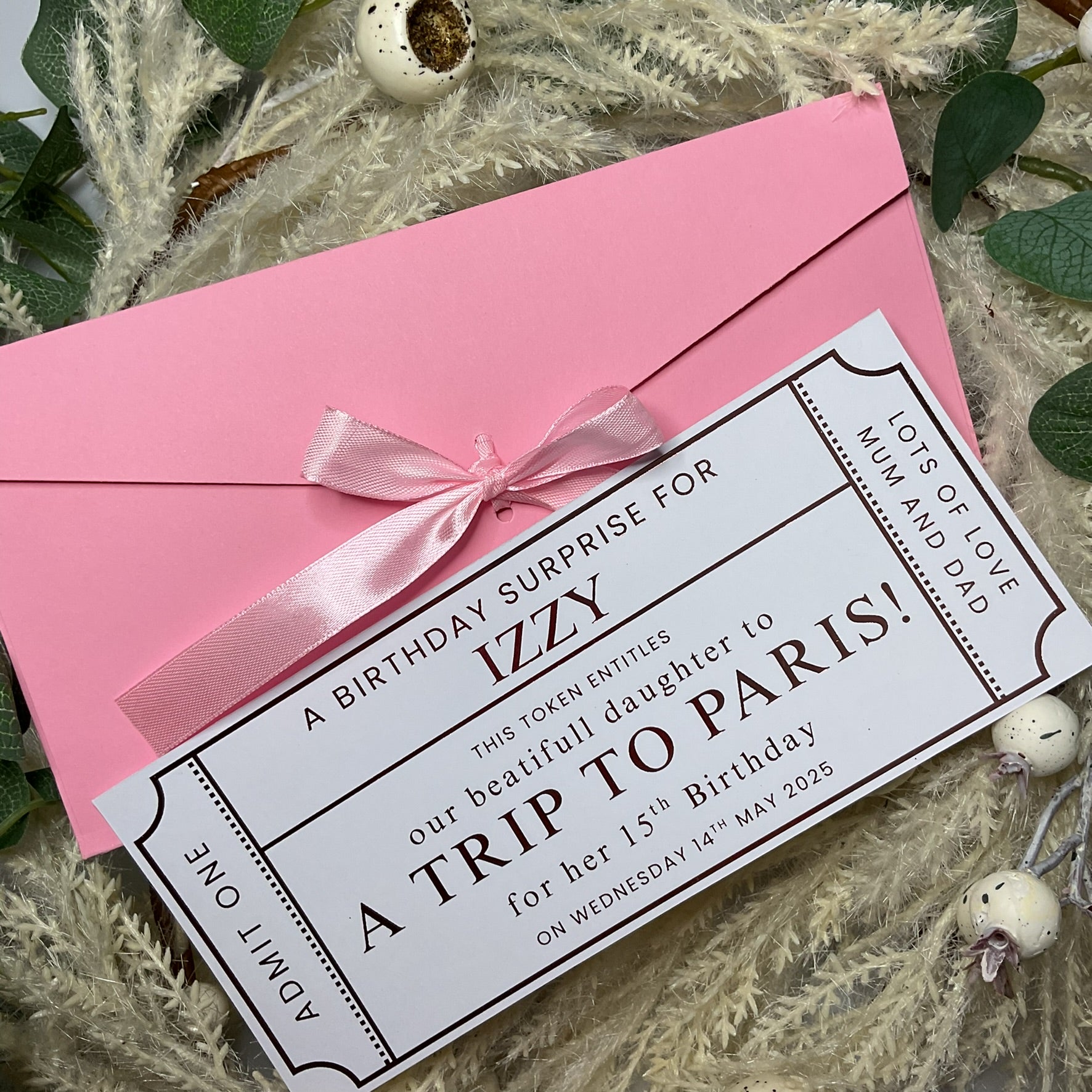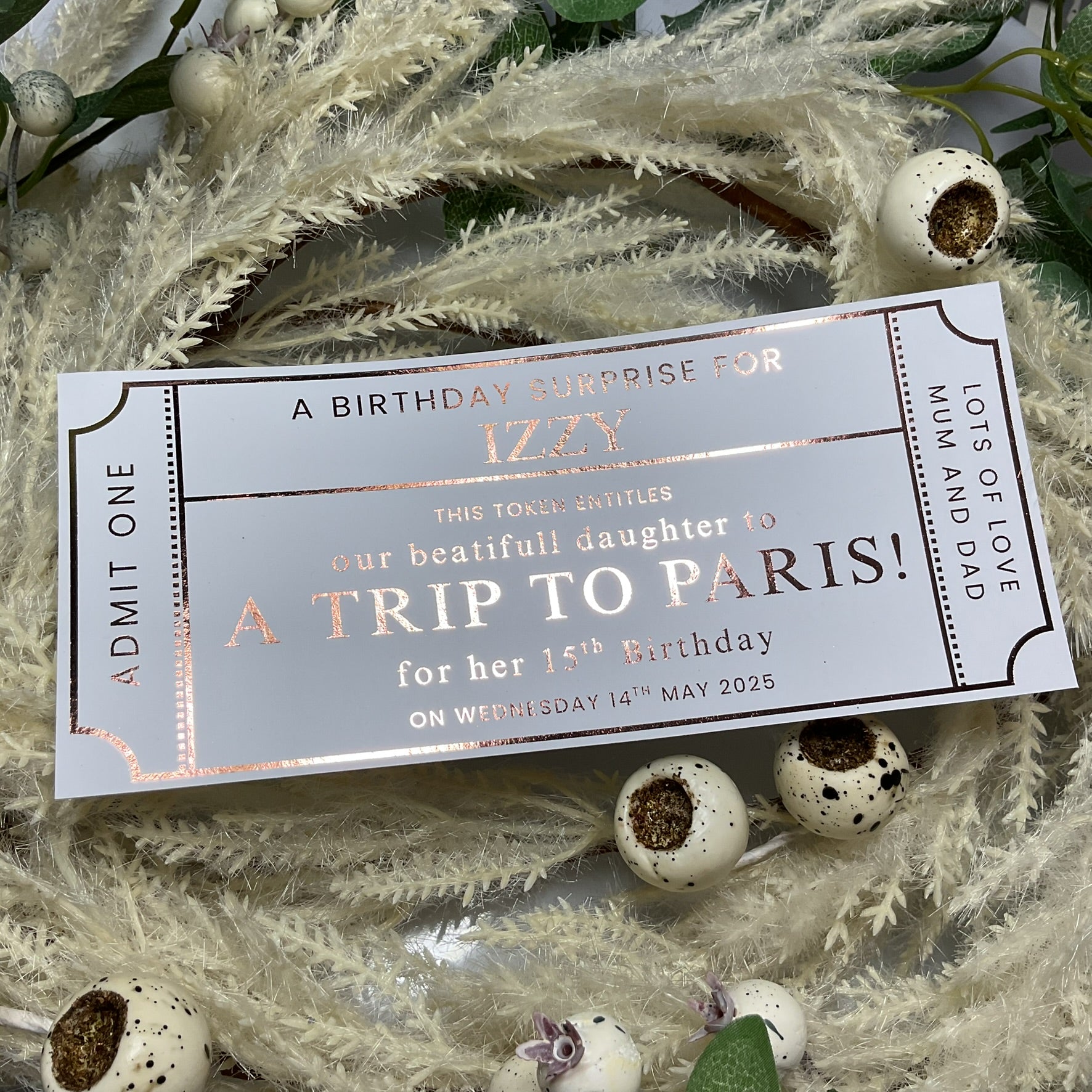 Fully Customisable Details – Personalise with the Recipient's Name, a description of the Main Surprise (e.g., A Trip to Paris!), the Date/Occasion (e.g., her 15th Birthday), and a 2-Line Personalised Message from the sender (e.g., Lots of love Mum and Dad).